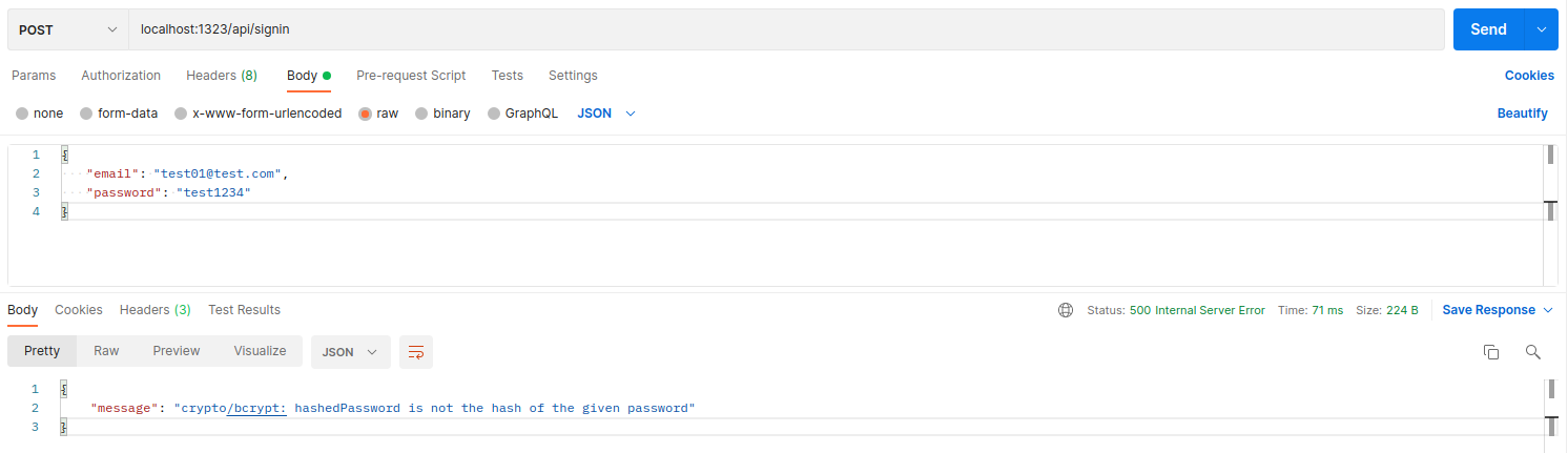 go run main.go우선 회원 생성 시 입력했던 비밀번호와 다른 값을 요청해본다.