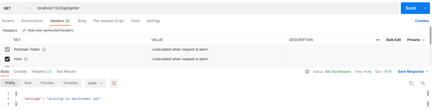 토큰이 없는 상태에서는 Status 400 Bad Request와 "missing or malformed jwt" 메시지를 확인할 수 있다.