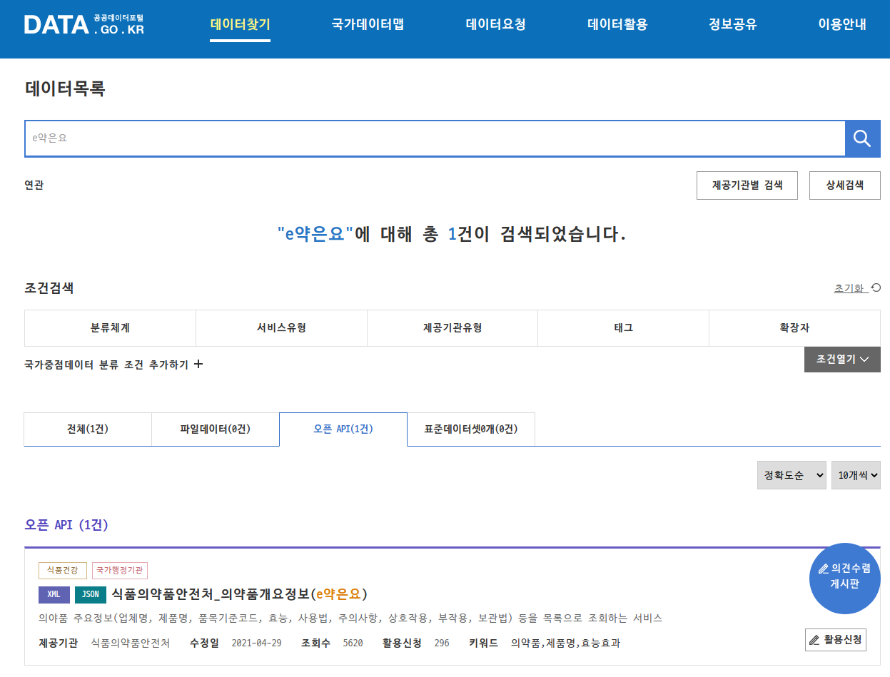 검색창에 "e약은요" 라는 키워드로 검색하면 분류 조건에서 오픈 API에 1건의 정보가 확인되는데 우리는 이 오픈 API를 활용할 것이므로 활용신청 버튼을 누른다.
