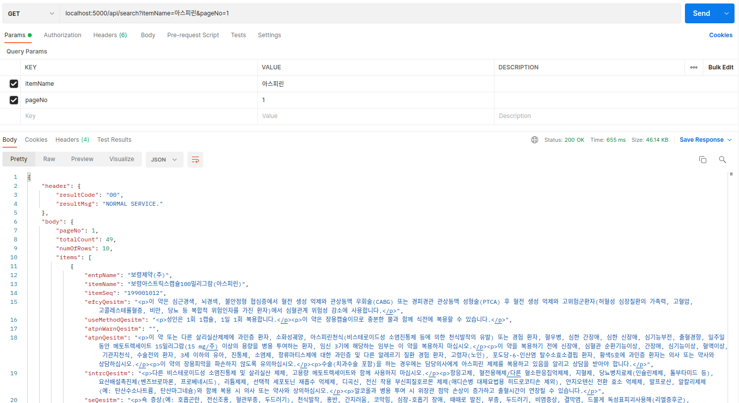 localhost:5000/api/search?itemName=아스피린&pageNo=1
