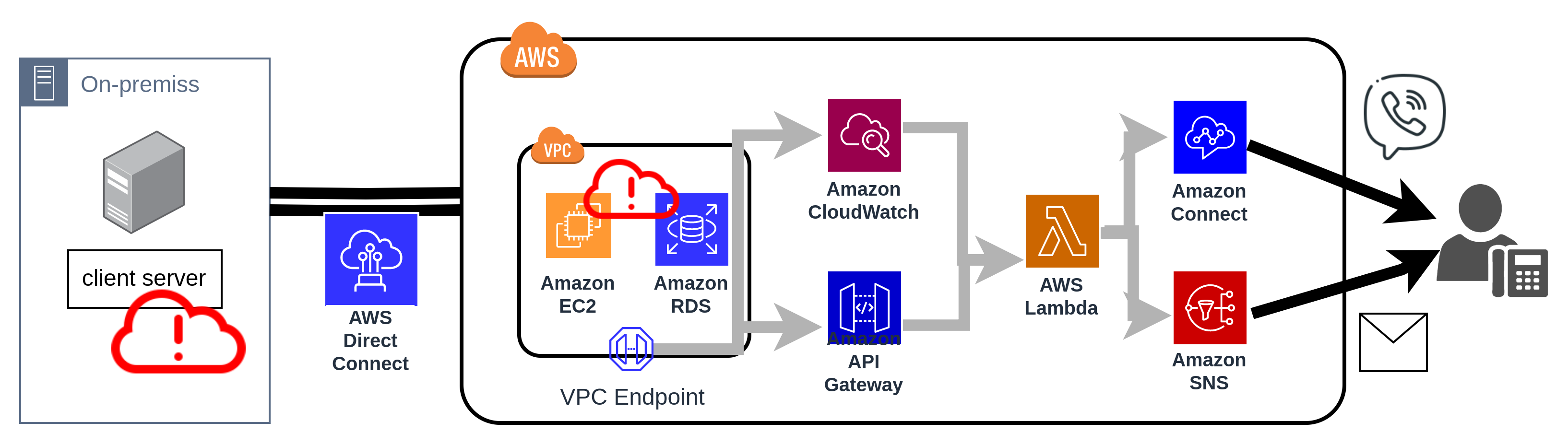 온프레미스 환경에서 프라이빗 네트워크 통신에서 API Gateway까지의 통신경로 API Gateway를 통해 페이로드에 담긴 내용을 통해 Lambda는 Amazon Connect의 아웃바운드 호출 API를 호출해 보수담당자에게 전화를 걸어 치명적인 에러 발생 사실을 알리고 Amazon SNS를 통해 에러 내용을 메시지로 전달한다.